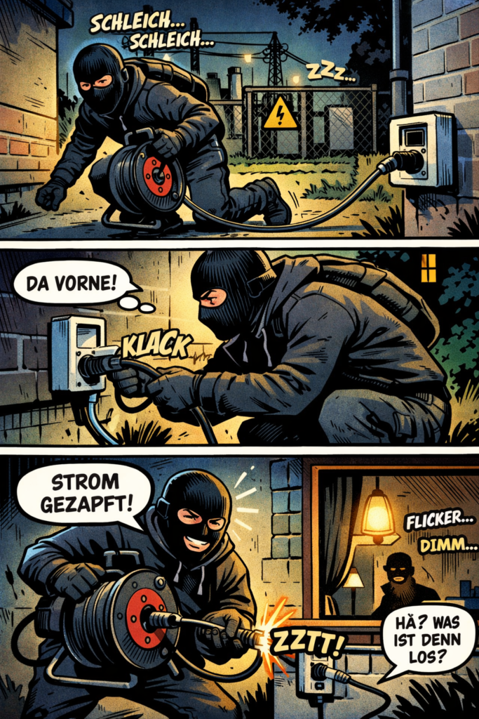 Wir hatten am Donnerstag, den 5.3. 26 die Polizei in unserer Anlage. Der Pächter von Garten 52 bemerkte einen ihm unbekannten Stecker in seiner Küche. Er verfolgte das gut versteckt verlegte Kabel bis zu seinem Gartenzaun. Auf der anderen Seite des Angrenzenden Weges, fand die vom Vorstand informierte Polizei, im Gebüsch zwischen den Gärten 63 und 63a das passende gegenstück, des Kabels, welches der ehemalige Pächter vom Garten 63 und immernoch Besetzer der Parzelle ist mutmaßlich nachts über den Weg verlegte, um die Leitungen zu verbinden und so den Strom auf Kosten des Pächters von Garten 52 zu nutzen. Der verdächtige wurde nicht in der Laube angetroffen, ein Ermittlungsverfahren wurde eingeleitet.
